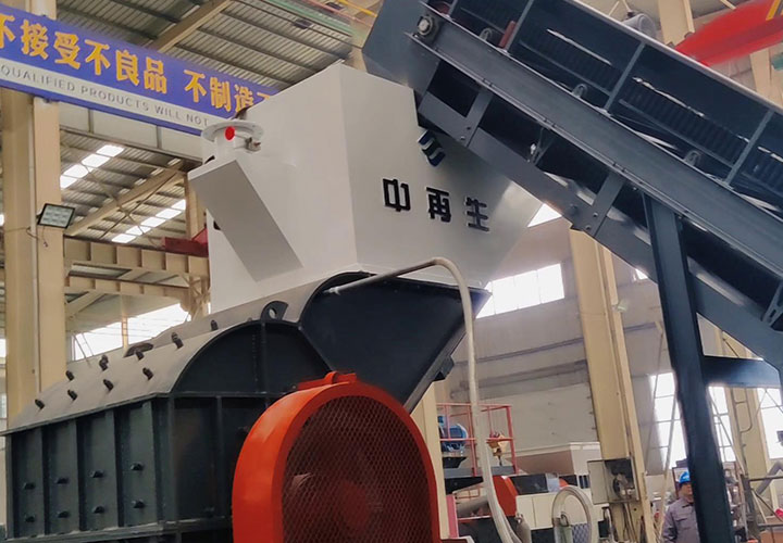 破碎線主機(jī)殼體采用特厚鋼板制造,內(nèi)襯為高錳鑄鋼件,可更換;主機(jī)轉(zhuǎn)子盤安裝于水平軸上,轉(zhuǎn)子盤圓周分布有銷軸,軸向懸有錘頭;主軸用滾珠軸承支撐,循環(huán)油強(qiáng)制潤(rùn)滑冷卻,并裝有溫度傳感器;進(jìn)料口裝有液壓輥筒喂料裝置,位置一高一低,同向旋轉(zhuǎn),能將大件松散物料壓扁,送入破碎腔內(nèi)。