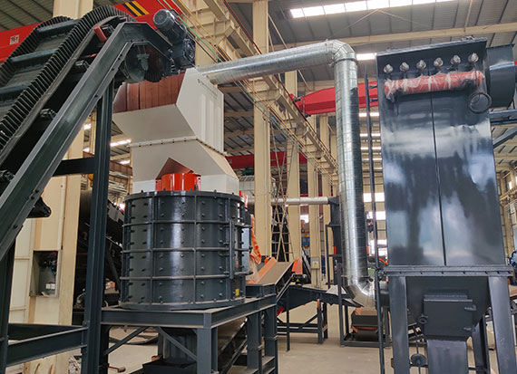 破碎線主機殼體采用特厚鋼板制造,內(nèi)襯為高錳鑄鋼件,可更換;主機轉子盤安裝于水平軸上,轉子盤圓周分布有銷軸,軸向懸有錘頭;主軸用滾珠軸承支撐,循環(huán)油強制潤滑冷卻,并裝有溫度傳感器;進料口裝有液壓輥筒喂料裝置,位置一高一低,同向旋轉,能將大件松散物料壓扁,送入破碎腔內(nèi)。