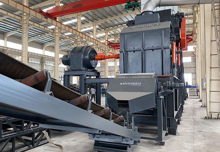 破碎線主機殼體采用特厚鋼板制造,內襯為高錳鑄鋼件,可更換;主機轉子盤安裝于水平軸上,轉子盤圓周分布有銷軸,軸向懸有錘頭;主軸用滾珠軸承支撐,循環油強制潤滑冷卻,并裝有溫度傳感器;進料口裝有液壓輥筒喂料裝置,位置一高一低,同向旋轉,能將大件松散物料壓扁,送入破碎腔內。
